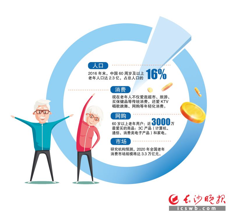 随着我国人口老年化的加剧,其带动的万亿银发经济,正在成为新的经济增长点,堪称一片投资蓝海。近日,记者走访长沙市场发现,现在的老年人其实很潮很爱逛,不仅爱逛超市、旅游、购买保健品等传统消费,还喜欢进KTV唱歌跳舞、网购等年轻化消费。不过,由于目前整个银发经济仍处于起步不久的“年轻”阶段,针对老年人量身定制的消费有限,所以并不能满足广大老年人日益增长的消费需求。